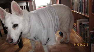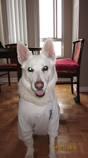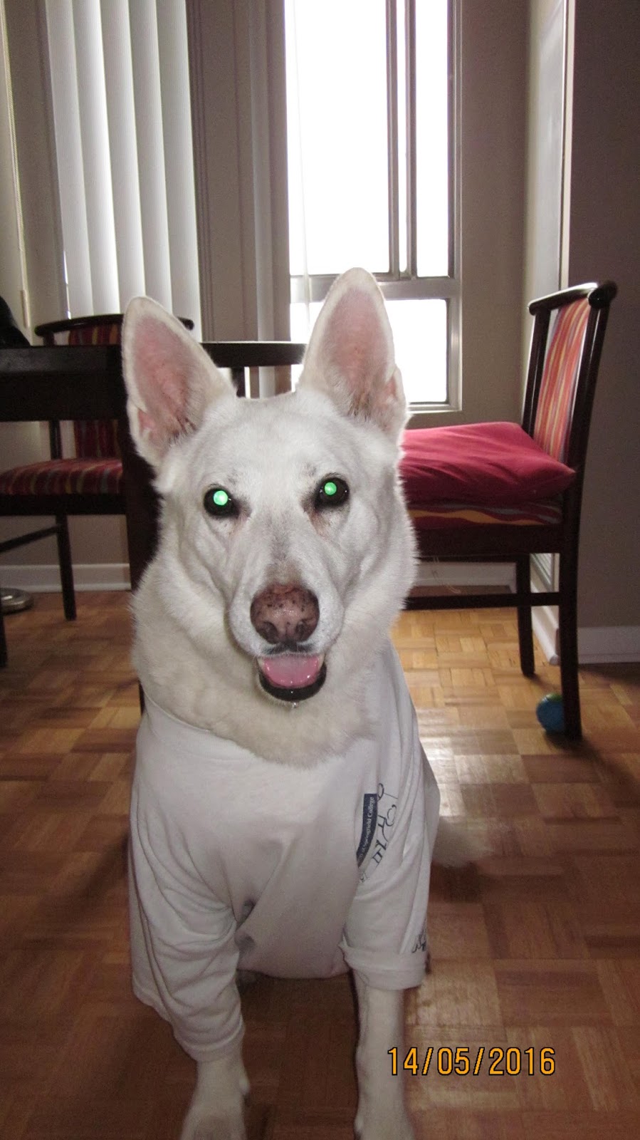 She doesn't need the Cone of Silence* this time, but the surgeon recommended she wear a t-shirt to keep protect the incision site. Tala accepts it with grace.
