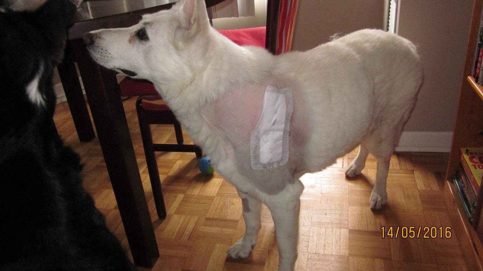 Tala is doing great! Of course she was exhausted and a bit wobbly when she came home, but now she's well rested and back to herself. And she looks a whole lot better without a disgusting, oozing tumour sticking out of her side! More importantly, there's a 75% chance the cancer won't come back.