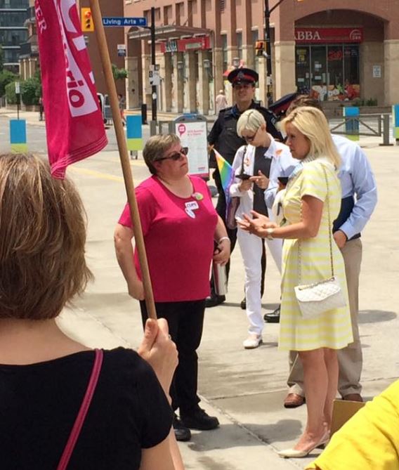 The Mayor was taking part in a small ceremony to raise the Pride flag, the first time the Pride flag has been flown at Mississauga City Hall. We formed a semi-circle around the ceremony, and were quiet and respectful while the ceremony continued. Meanwhile our allies from CUPE Ontario were deciding what we would chant when the ceremony was over!