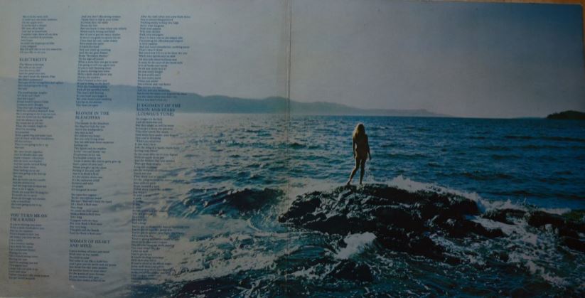 This cover is a really interesting mix. On the front, Joni dressed in deep earth tones, sitting on the ground in the woods. (It's actually taken at her BC hideaway.) Inside, an original painting, and a seascape with a nude photo.