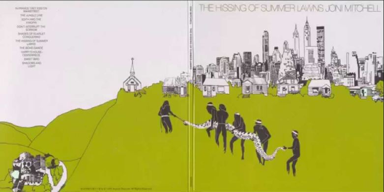 Joni has drawn a pen-and-ink landscape, the world of the songs contained therein. In the foreground, the jungle line, and perhaps the boho dancers, make their way across a lush green. Two spots of pool-blue show us Harry's house, and the world where the lawns are hissing. Or maybe Joni's house, as inside, she is shown in her pool. The album cover is evocative and enigmatic, like the album.