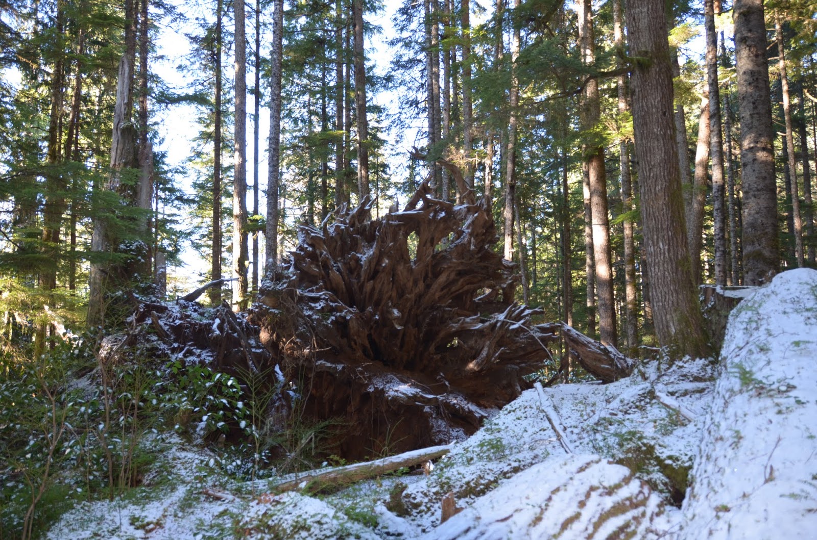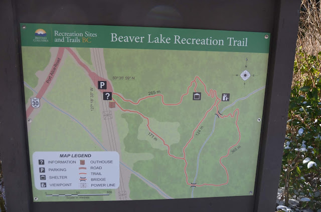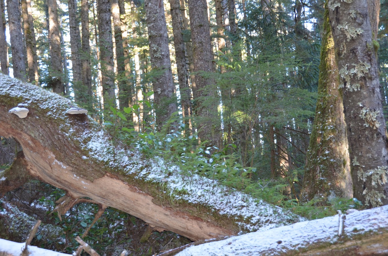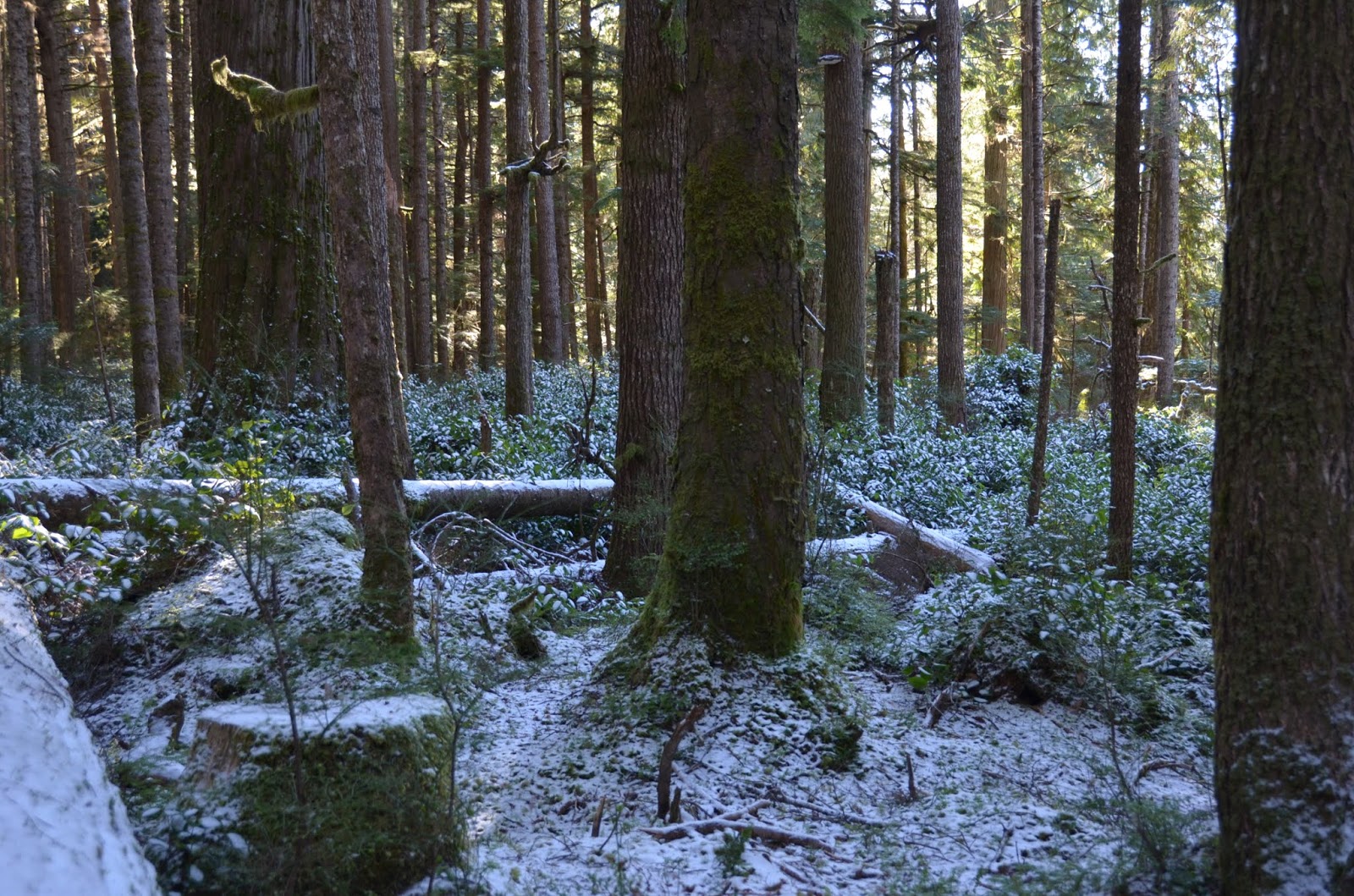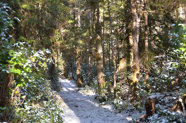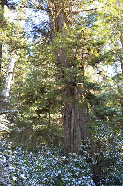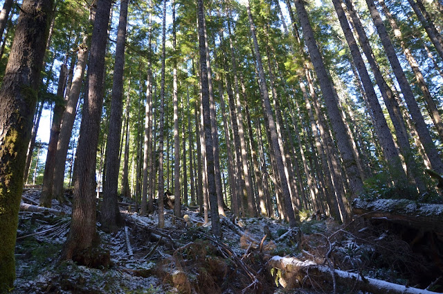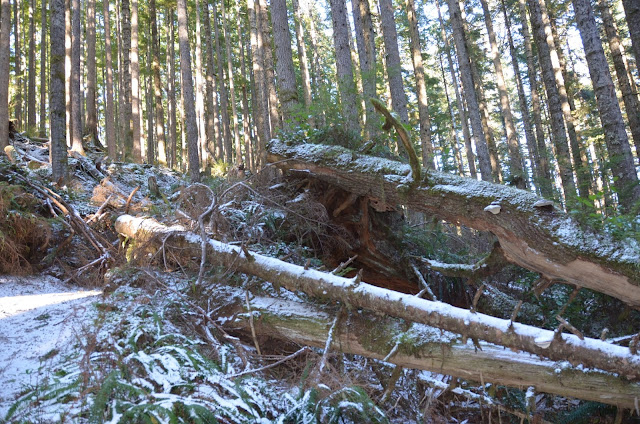 Last weekend, we hiked in the Beaver Lake Recreation Trail -- the first time I've ever hiked in winter. There was a dusting of snow and it was cold enough to wear a parka. The trail is full of interpretative signs about the forest, pointing out old growth, second growth, "managed", and other stages. The information is sponsored by the lumber company, so you have to translate the propaganda a bit, but it was still interesting to think about the woods this way. Plus because it was cold and dry, there were no (visible) mushrooms.