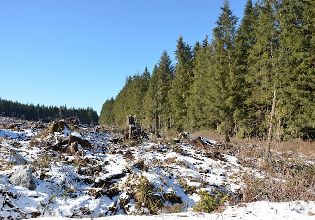 Every so often you come upon an area that appears to be freshly logged, not yet replanted. It has a look of brutal destruction, although much of the forest has been logged and re-grown.