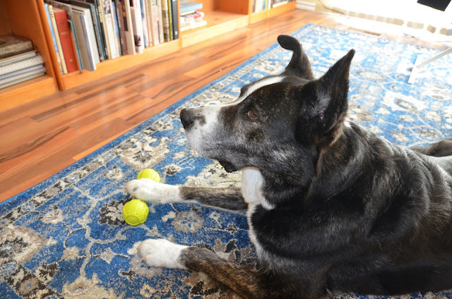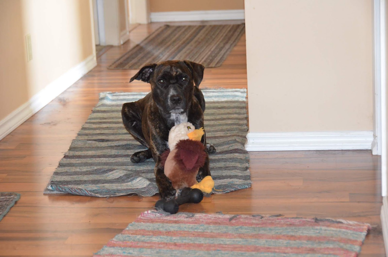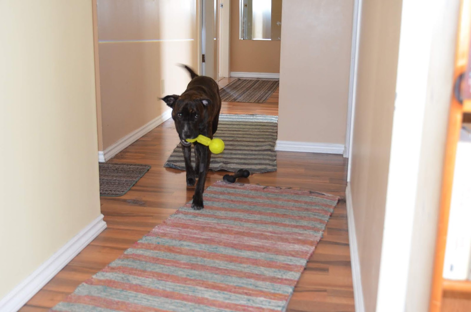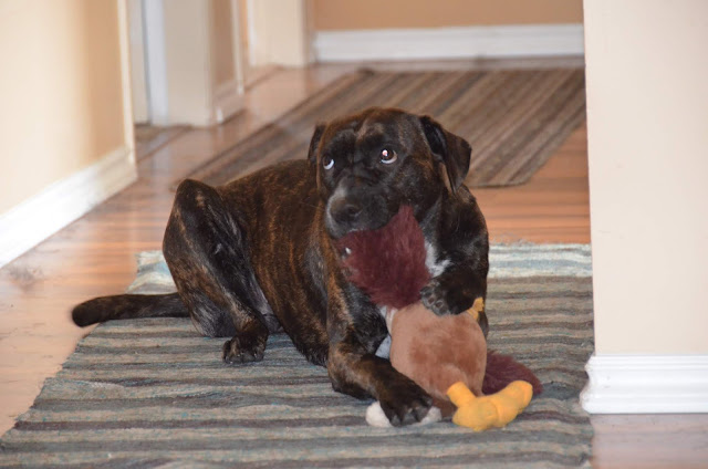 2. She loves toys. Kai always wants to have a toy handy. If she runs off to greet one of us, she first grabs a toy. If she's lying quietly, she wants to have a toy nearby. Tala was the same way, and this reminds us of T, in a good, not-totally-heartbreaking way. Final Foster Mom brought a bagful of Kai's toys, and they're all over the house.