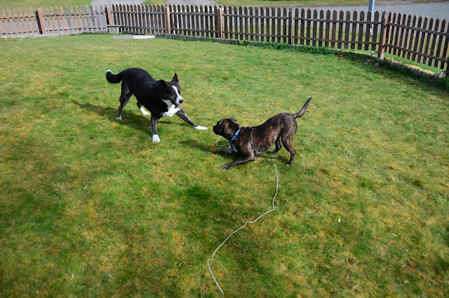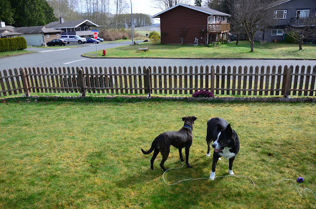 | The yard is only partially fenced, so until we close the gap, Kai is tethered. She doesn't seem to mind. |