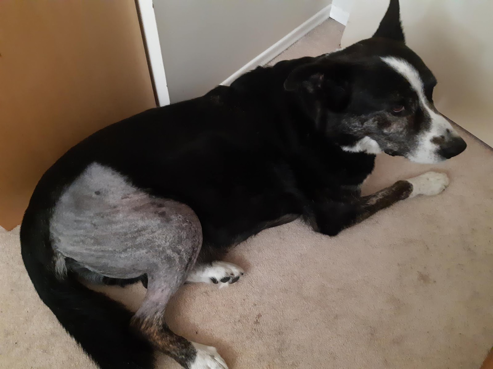I say he seems to be all right because he's so quiet and sad. He can stand on three legs to eat his food, and he hobbles around the yard on-leash, but getting from standing up to lying down is a nightmare. It can take him 30 or 45 minutes to figure out how to lie down, or perhaps to get up the courage to try, because it's clearly painful. When he finally exhausts himself standing, he lies down with obvious difficulty.