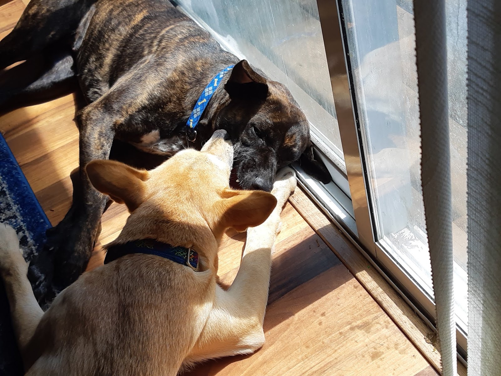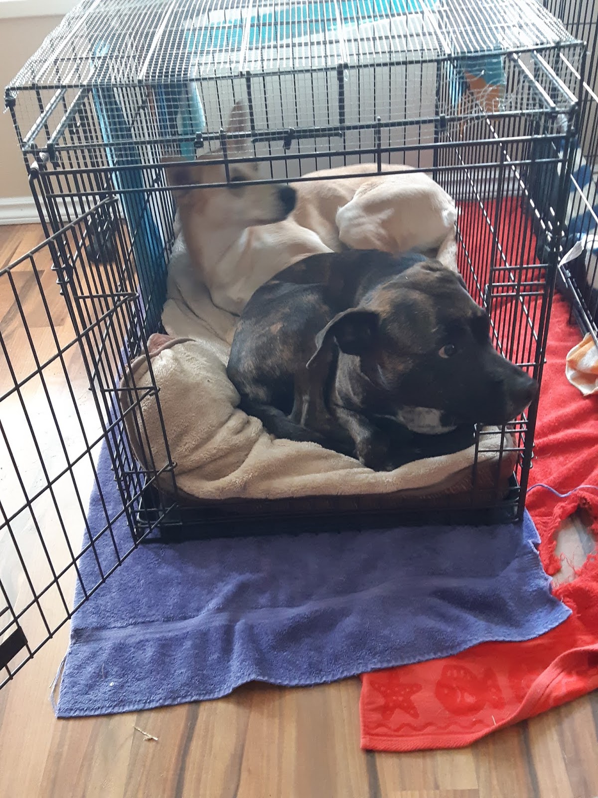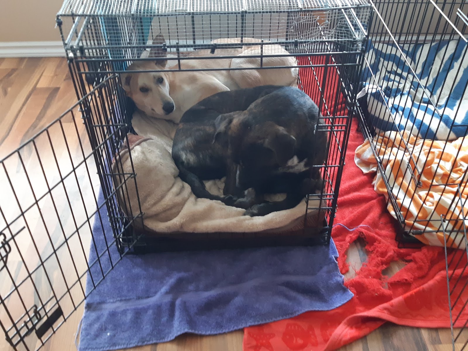 Back at home, we are reaping the payoff of the well-exercised dog: the quiet. How quiet? They actually went into the same crate! That's Kai's empty crate beside them. We have never seen this before.