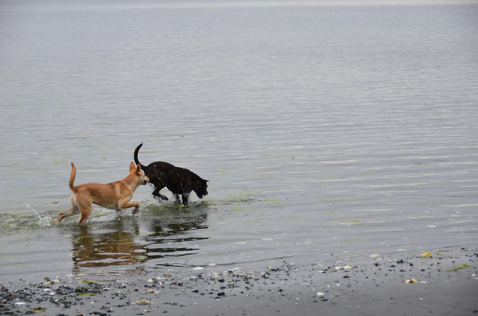 First we let the dogs loose on a semi-enclosed field near the beach. It was the first time the Kai and Cookie have really had room to run at full speed together. It was a sight! They were flying. We practiced some recall, trying to give Cookie the idea, then we went over to the beach itself.