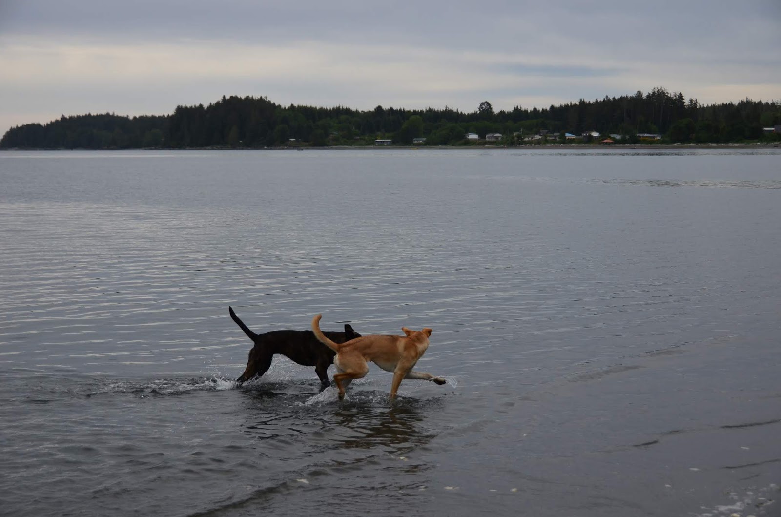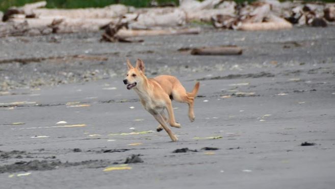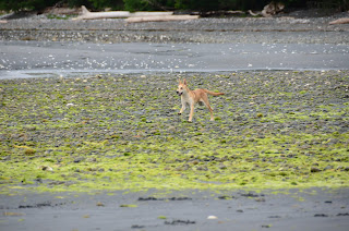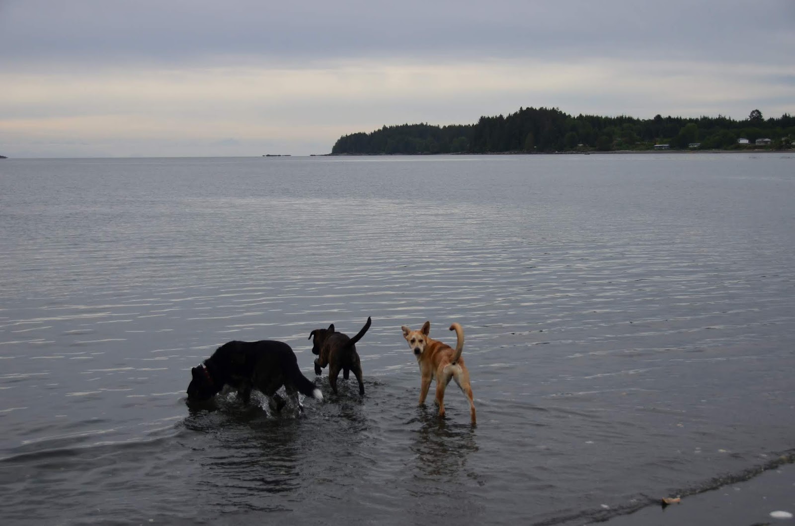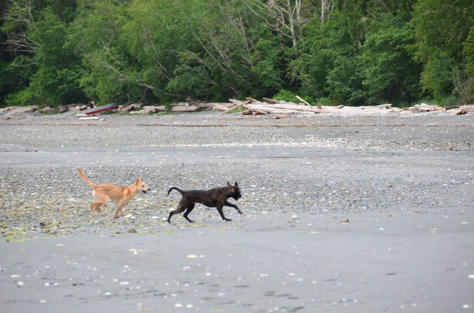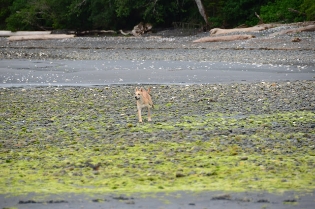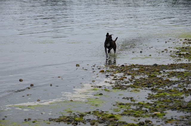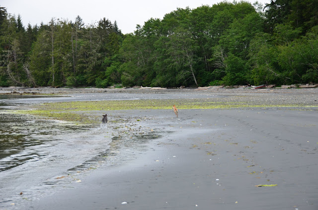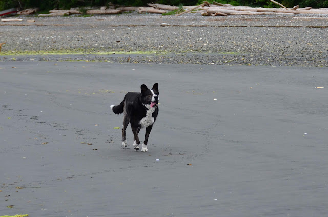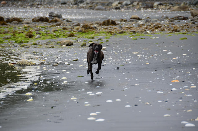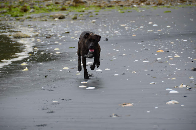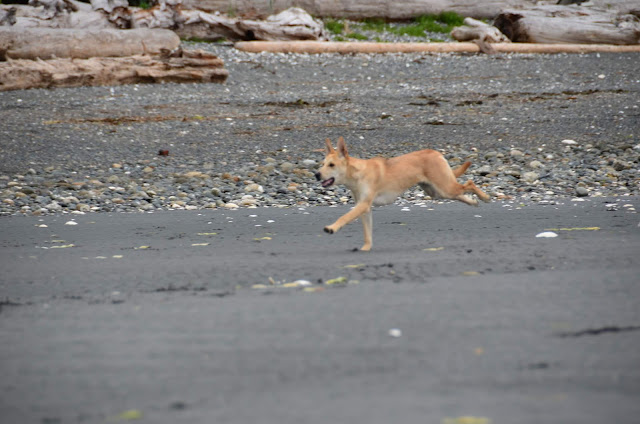 We had been waiting to take Cookie for a run at the beach -- waiting until she was more bonded with us, until she had a bit of training, until she seemed to understand that we five are a family. There are no enclosed dog parks near us -- or, to my knowledge, anywhere north of Campbell River. There's a baseball field and a schoolyard nearby, but both too near the road for comfort. We knew that at some point, we'd have to make a leap and hope for the best. Today was that day.