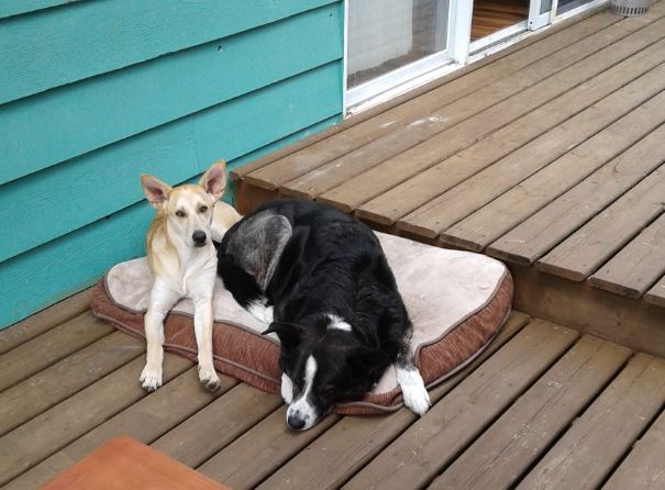 Cookie is so affectionate -- not just to us, but to her canine packmates, too. She likes to squeeze in on a bed (or a crate!) that one of the other dogs is already using. This never fails to melt me.
