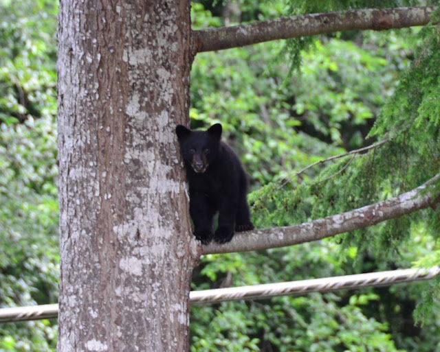 He was crying and mewing so loudly, we were worried he was scared or in distress. So I spoke to a conservation officer and got a little bear education. He said the bear was frightened up the tree (by the sound of dogs or people) and the vocalizing was telling mama bear where he is. Then when the perceived threat is gone, cub climbs down the tree and reunites with mama.