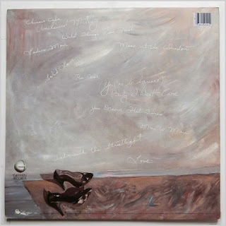 I really like this album cover. On the front, Joni's given us another self-portrait, in a casual, jaunty pose, but with a serious or neutral expression on her face. She's leaning on a television, which is showing another of her paintings -- a herd of wild horses, running fast. In the same room, used on the back cover, are a pair of women's shoes, black heels that appear hastily kicked-off.