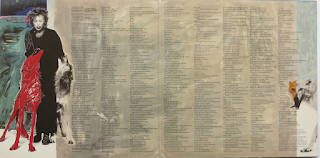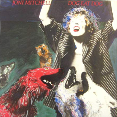 "Dog Eat Dog," for instance, had a large canvas, 10-foot-by-5, all dogs, God dog, Jesus dog, you know, and racial dogs in conflict and so on. I sold that painting in Tokyo. Geffen told me that, "Okay, Joan, we know you're an artist, but stick your picture on the cover." So I did a kind of a collage being attacked by wild dogs, you know, and that was fun to do. So there were really two album covers for that. But he wanted my kisser on the cover, so I had to give it to him (laughs). The patron, the great patron, spoke.To me, the dogs look like wolves, and Joni appears, not being attacked, but raising her arms and closing her eyes in a kind of ecstasy, perhaps singing and dancing. There's more interesting information about this cover here on the Joni Mitchell website.